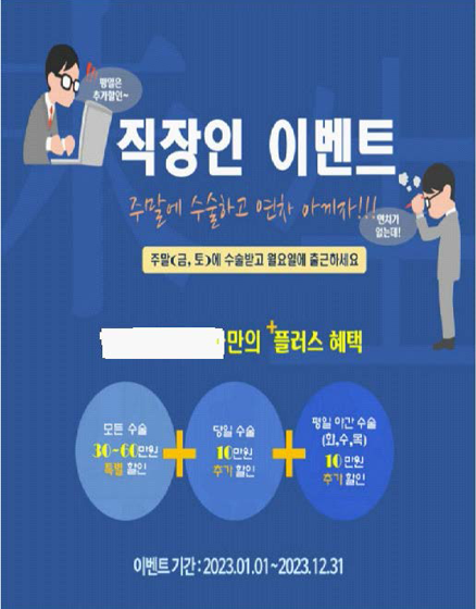 이 중, 특히 '모든 수술 30~60만 원 특별 할인'이라는 문구가 문제인데, 할인 대상이나 범위가 구체적으로 명시되지 않아 소비자에게 오인을 줄 수 있다는 점이 위반 사유가 될 수 있습니다.