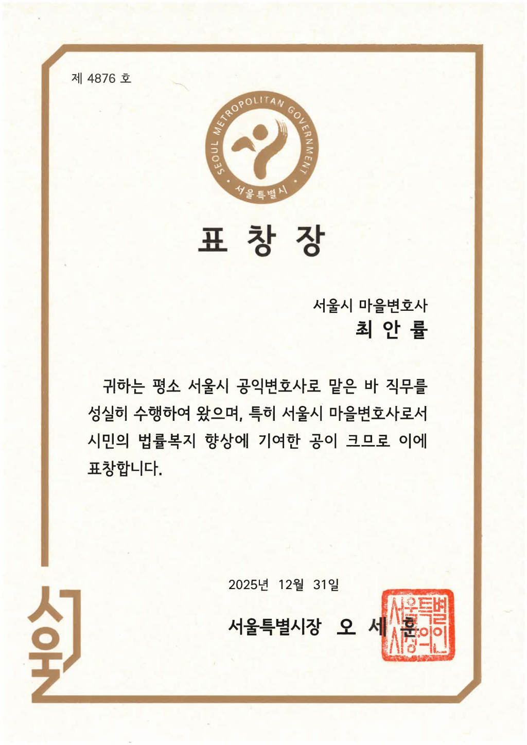 법무법인 명재의 최안률 대표변호사가 지난 2025년 12월 31일, 서울시 마을변호사로서 시민들의 법률 복지 향상에 기여한 공로를 인정받아 오세훈 서울시장으로부터 표창장을 수여받았다.