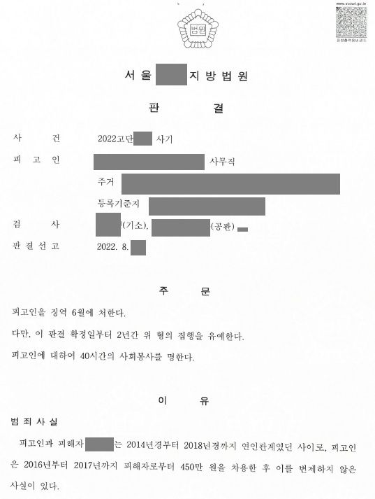 경찰은 비록 전 남자친구에게 기존의 채무가 많았지만 그만큼 월 수익도 많았기 때문에 돈을 차용할 시점에 변제의사나 변제능력이 있었던 것으로 보인다며 불송치결정을 하였으나, 적극적으로 이의신청을 한 결과 검찰은 경찰의 결정을 뒤집고 사기죄를 인정하여 불구속구공판을 하였습니다. 의뢰인은 가해자로부터 합의금을 받아 피해를 회복할 수 있었고, 법원은 합의가 이루어졌음에도 가해자인 남자친구에게 징역 6월에 집행유예 2년, 40시간의 사회봉사를 선고하였습니다.판을 하였습니다. 의뢰인은 가해자로부터 합의금을 받아 피해를 회복할 수 있었고, 법원은 합의가 이루어졌음에도 가해자인 남자친구에게 징역 6월에 집행유예 2년, 40시간의 사회봉사를 선고하였습니다.