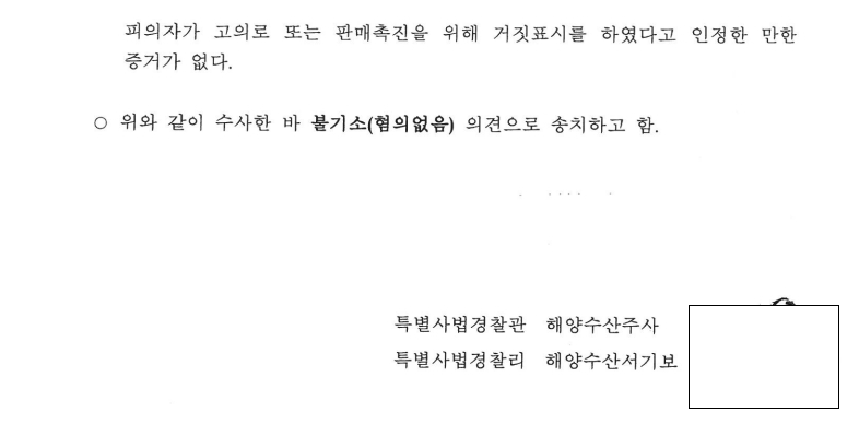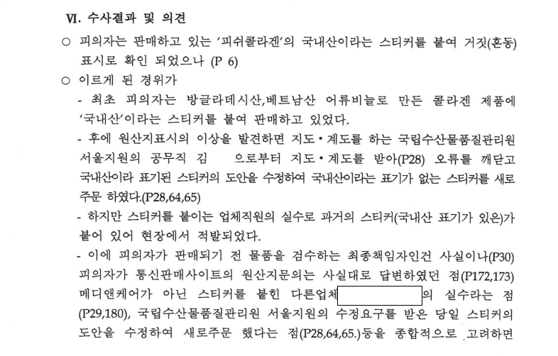 원산지 표기 방법에 따르면 국내에서 가공하는 수산물 가공품의 원재료가 외국재료인 경우, 후면 성분표에 (원재료 : 어류비늘 - 방글라데시와 인도네시아산)이라고 정상적으로 기재하고 있었음에도 불구하고, 전면 스티커도 문제가 될 수 있어 수정하라고 발주를 넣은 사실 등이 수사과정에서 모두 확인되어 최종적으로 무혐의 처분을 받은 사건입니다.