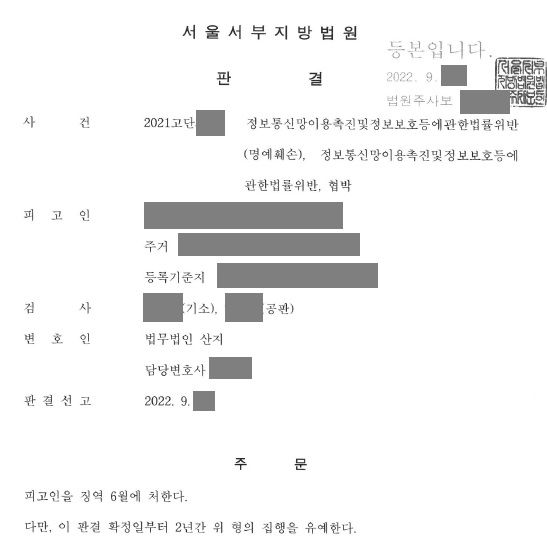 법원은 정보통신망법상 명예훼손, 불안감조성, 협박죄를 모두 유죄로 인정하고 가해자에게 징역 6월, 집행유예 2년을 선고하였습니다. 명예훼손, 불안감조성 등의 죄명에 대해서는 통상적으로 벌금형이 선고되는 것에 비하면, 징역형이 선고된 것은 그만큼 법원이 가해자의 죄질을 나쁘게 보았기 때문으로 소송 과정에서 이루어졌던 추가적인 범행에 대해서도 추가 고소가 이루어진다면 추후 실형 선고까지도 가능할 것으로 보입니다.