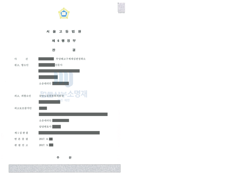항소심 법원은 원심 판결을 파기하고 A에 대한 부당해고를 인정한 중앙노동위원회의 재심판정을 취소하였습니다. 이는 지노위, 중노위, 1심 법원에 이르기까지 이어져 온 "00신문사의 A에 대한 정규직 전환 거부는 부당해고"라는 논리를 뒤집고, 사측의 합리적인 인사권 행사라는 저의 주장을 받아들인 것이었습니다.