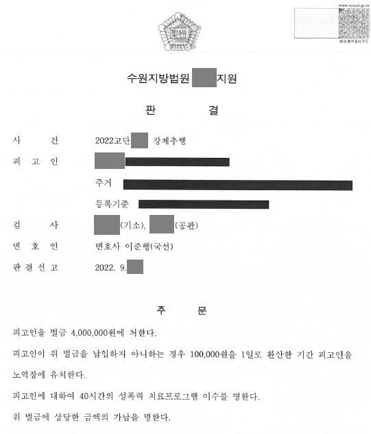 법원은 가해자에게 강제추행 혐의를 인정하고 벌금 400만원의 유죄 판결을 선고하였습니다. 가해자가 초범에 술에 취해있었다는 점, 피해자 또한 사건 초기 가해자를 용서하려고 했었다는 점 등이 고려되어 처벌 자체는 엄하지 않았지만 피해자 진술 외에는 별다른 증거가 없는 사안에서도 가해자의 억지 주장을 충분히 탄핵할 수 있다는 것을 보여준 사건이었습니다.