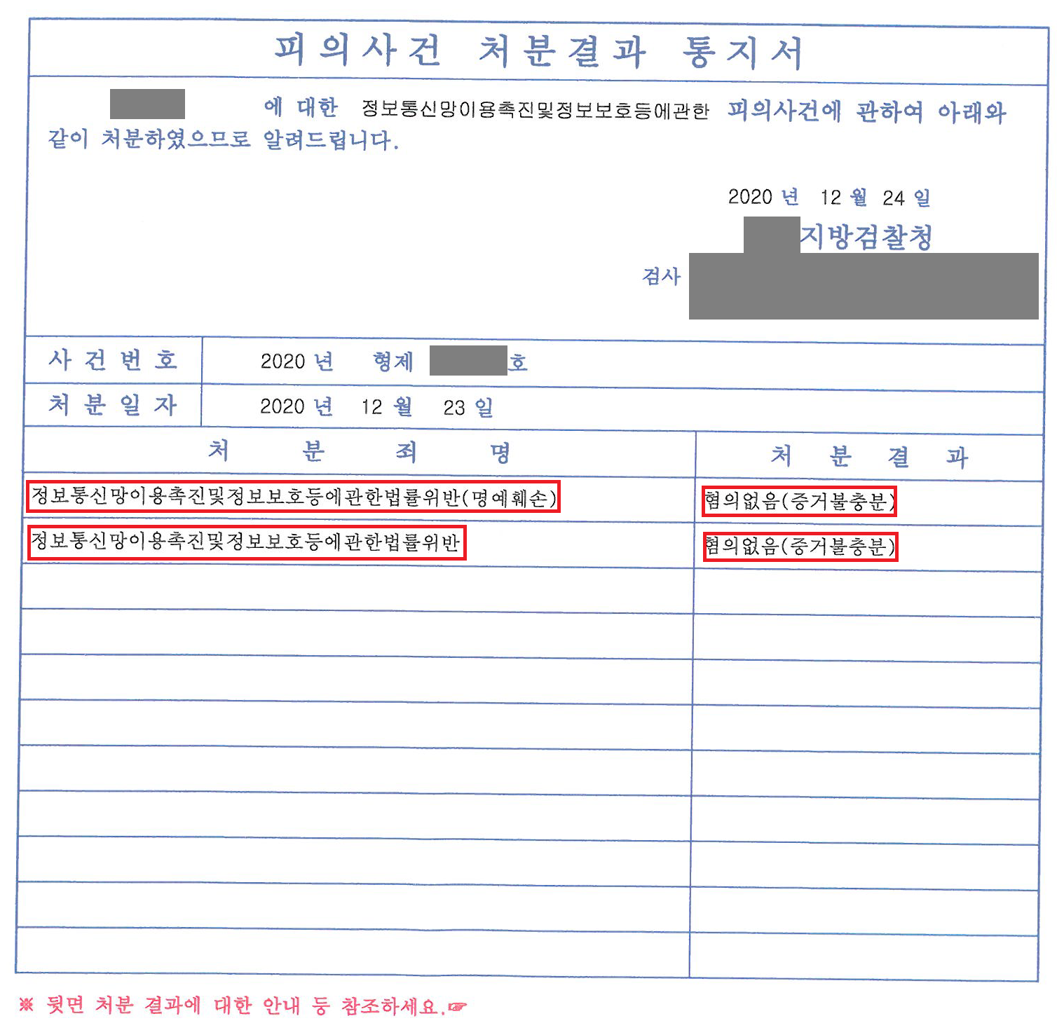 경쟁업체가 의뢰인을 고소한 죄명은 정보통신망을 이용하여 허위사실을 유포하고 명예를 훼손하였다는 것, 정보통신망을 통하여 불안감이나 공포심을 조장할 수 있는 내용을 반복적으로 게시하였다는 것이었습니다. 의뢰인은 법무법인 명재의 도움을 받아 허위사실을 유포하지 않았고, 상대방의 불법행위에 대하여 법적 조치를 예고한 것이 정보통신망법에서 금지하는 불안감 조성에 해당할 수 없다는 점을 법리적으로 설명하였습니다.