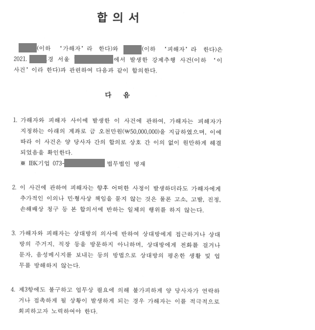 의뢰인은 합의금으로 5,000만원을 지급받아 형사고소나 추가적인 민사 손해배상 청구 없이 사건을 마무리 지을 수 있었습니다. 의뢰인은 결국 해당 회사로의 이직을 포기하였지만 합의금을 통해 조금이나마 피해를 위로받을 수 있었고, 가해자 또한 이 사건을 회사에 알리지 않기로 하여 성범죄 전과자가 되는 것을 피하고 직장도 지킬 수 있었습니다.