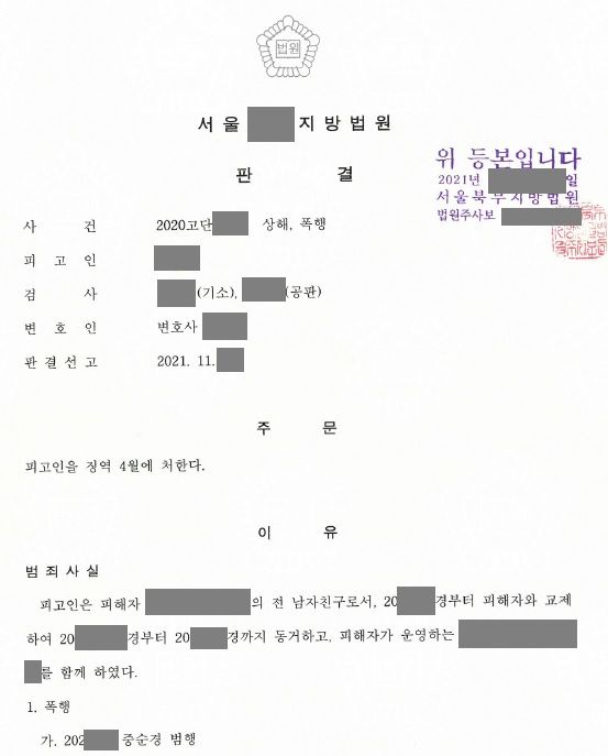 남자친구는 범죄 혐의를 전면 부인하면서 피해자의 증언은 물론이고 목격자 등 증인들의 증언에 대하여도 모두 증거부동의를 하였고, 증인신문을 하면서 피해자의 진술을 탄핵시키고자 노력하였습니다. 그러나 오히려 이를 괘씸하게 여긴 법원에 의해 징역 4개월을 선고받고 법정구속 되었습니다. 뒤늦게 남자친구는 가족들까지 동원하여 합의를 시도하였으나 의뢰인이 이를 거절하여 남자친구는 형기를 모두 마쳐야 했고, 의뢰인은 이와 별도로 민사 손해배상을 통해 약 1,400만원을 배상받을 수 있었습니다.