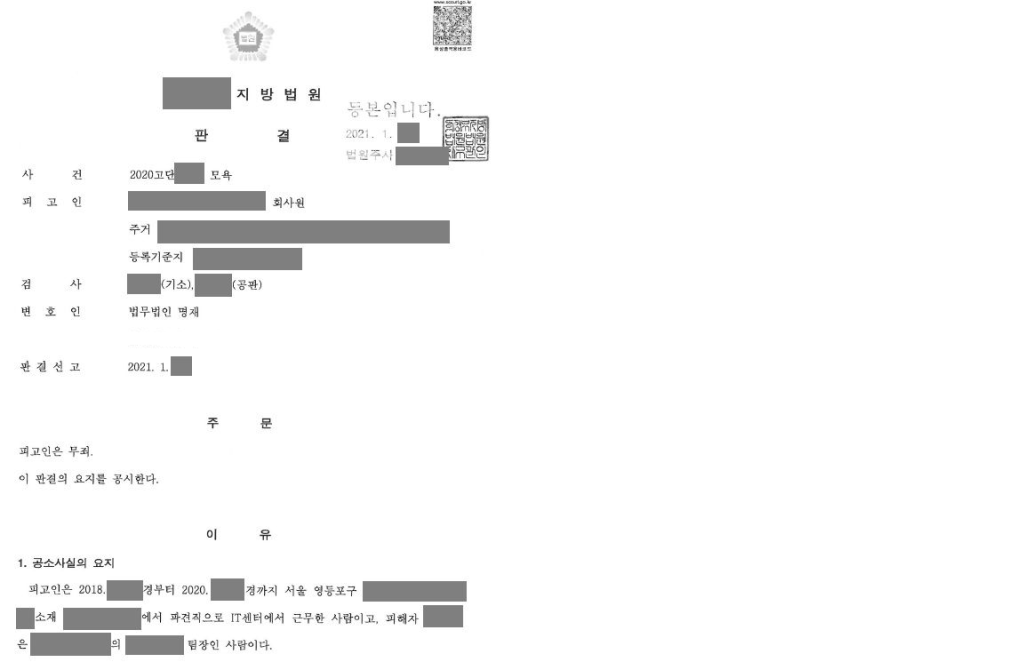 검찰은 법무법인 명재의 변론에도 불구하고 기소를 감행하였으나, 법원은 모욕죄에 대해 무죄 판결을 선고하였습니다. 검찰은 무죄 판결에 불복하여 항소를 하였으나 항소심 법원 역시 검찰의 항소를 기각하고 "골목대장", "앞잡이"라는 표현은 모욕죄의 구성요건에 해당한다고 볼 수 없다며 원심 판결을 유지하였습니다.