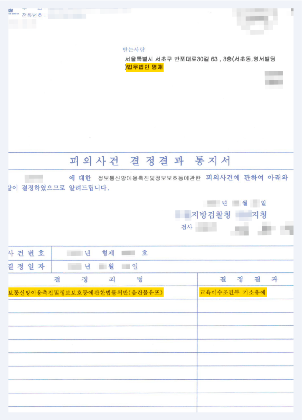 이에 피의자는 정보통신망이용촉인정보보호등에관한법률위반(음란물 유포)혐의로 입건되어 수사받게 되었습니다.