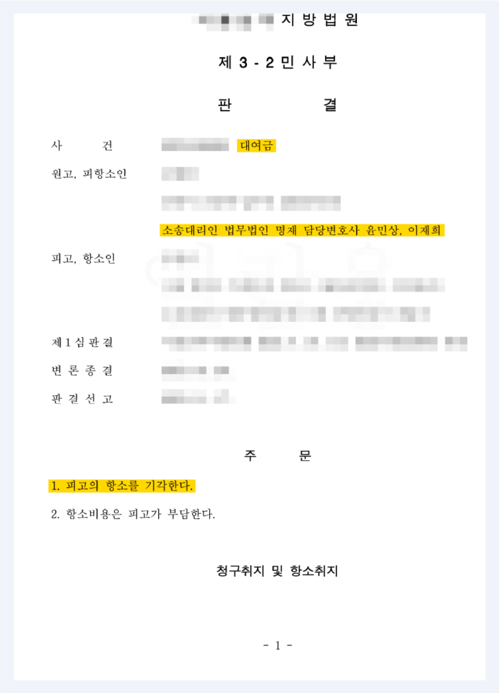 이재희, 최안률 변호사의 허를 찌르는 변론으로 결국 의뢰인은 1심과 2심 모두 승소할 수 있었습니다.