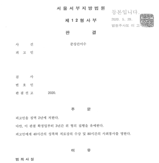 피의자는 강제추행이 아닌 강간미수의 혐의를 인정받아 징역 2년에 집행유예 3년, 성폭력 치료강의 및 사회봉사를 이행하라는 판결을 받았습니다.