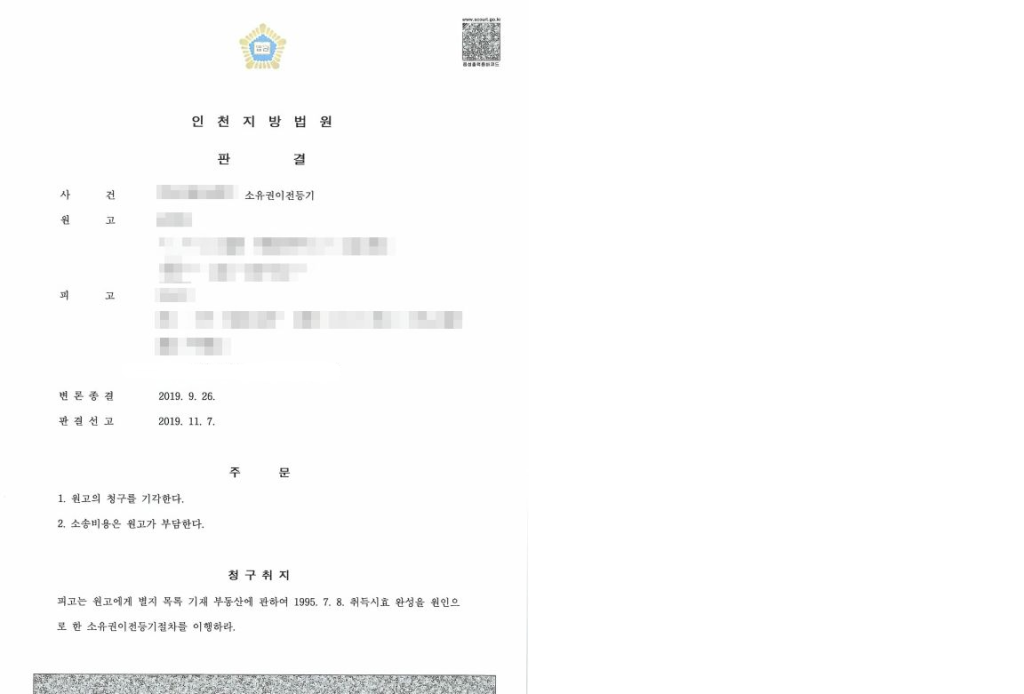 법원은 원고인 동생의 종택 점유가 무단점거라는 것을 인정하면서, 원고의 이 사건 주택에 대한 점유는 자신의 상속지분을 제외한 다른 공동상속인들의 지분비율 범위에서는 타주점유에 해당한다고 봄이 상당하다며 자주점유를 전제로 한 취득시효 완성 및 소유권이전등기 청구를 기각하였습니다. 덕분에 의뢰인은 동생과의 재산 분쟁으로부터 종택을 지키는 것은 물론이고, 추후 종택의 토지 소유권에 대하여도 권리행사를 할 수 있는 근거를 만들 수 있게 되었습니다.