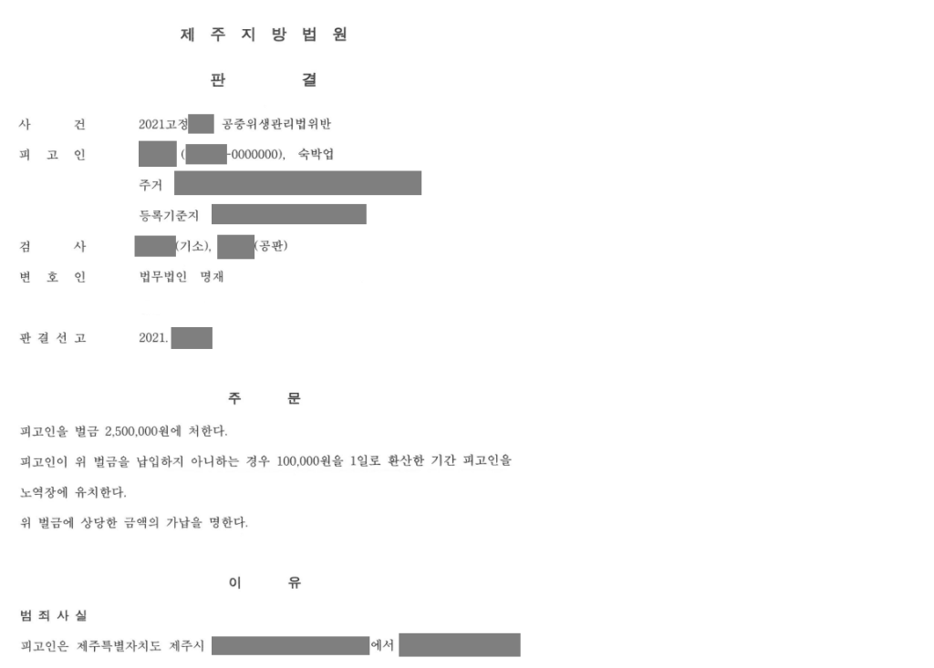 법원은 의뢰인에게 벌금 250만원을 선고하였습니다. 이는 검찰이 최초 약식기소했던 벌금형보다 줄어든 것일 뿐만 아니라, 에어비앤비를 통해 얻은 약 6개월간의 수익 3,600만원과 비교하더라도 현저히 적은 금액이어서 의뢰인은 만족할 수 있었습니다.