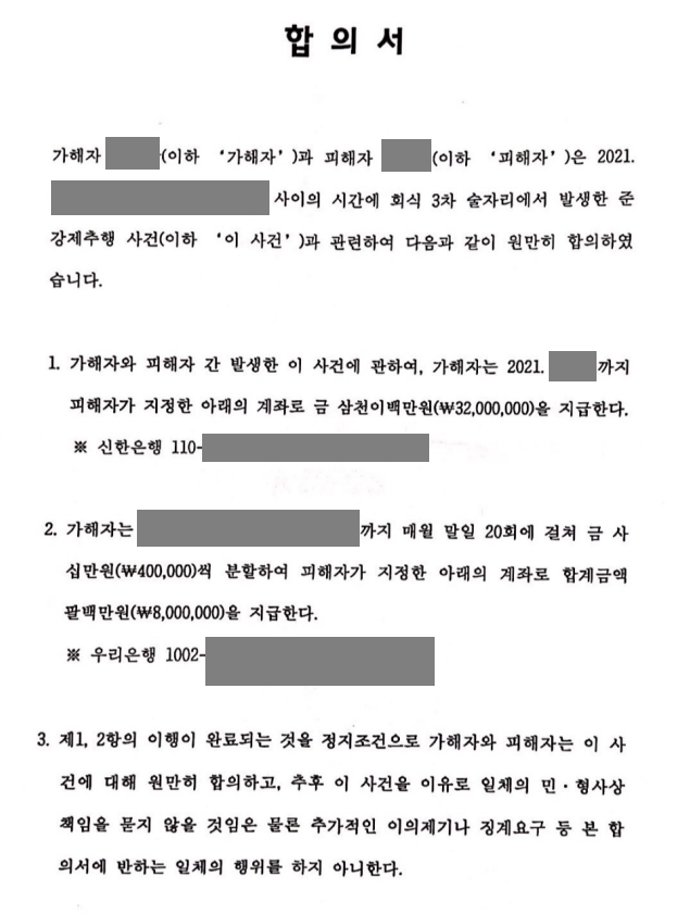 의뢰인은 합의금으로 4,000만원을 지급받고 형사 고소나 추가적인 민사 손해배상 청구 없이 사건을 마무리 지을 수 있었습니다. 강간 없이 추행만 있었다는 점을 고려하면 적지 않은 금액을 받아 의뢰인은 조금이나마 마음의 위로를 받을 수 있었고, 가해자는 형사처벌 없이 피해자로부터 용서를 받을 수 있었습니다.