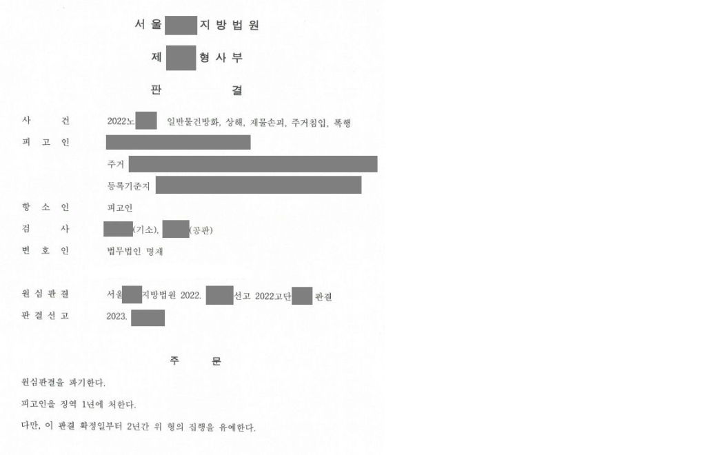 이렇게 의뢰인은 하룻밤 사이에 일반물건방화, 상해, 폭행, 주거침입, 재물손괴를 저질렀는데, 범죄 피해자도 2명이고 방화까지 하였기 때문에 중형이 예상되는 상황이었습니다.