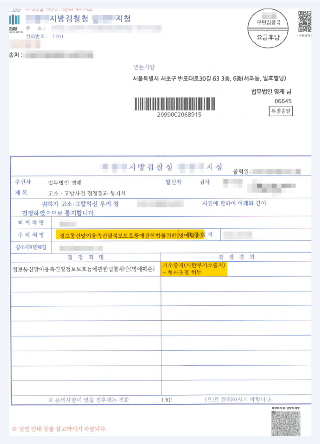 그 결과, 최안률 변호사의 정밀한 의견서와 체계적인 증거 정리를 통해 경찰은 피고소인들에게 정보통신망법상 명예훼손 혐의가 성립된다고 판단하게 됩니다.