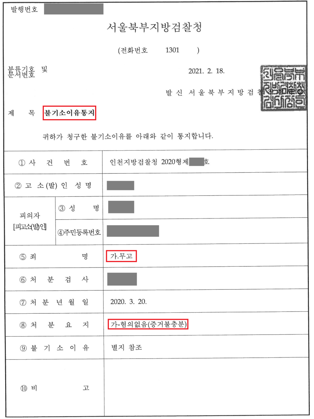 검찰은 법무법인 명재의 변론을 받아들여 무고 혐의에 대해 불기소처분을 내렸습니다. 덕분에 의뢰인은 이웃 사람으로부터 폭행을 당한 것도 억울한데 이를 용서해 주었다가 오히려 무고죄로 처벌받을 뻔했던 위기에서 벗어날 수 있었습니다.