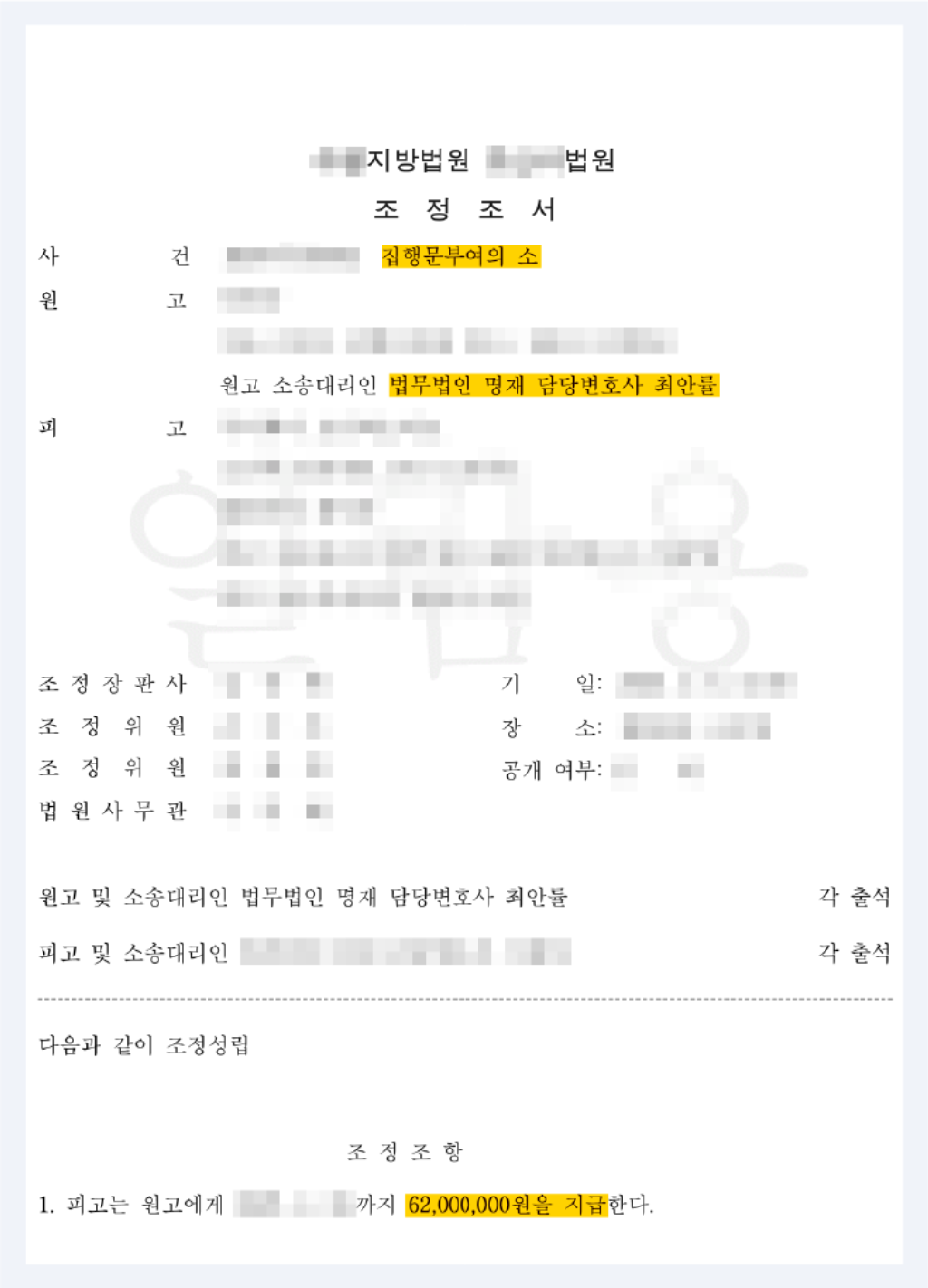 최안률 변호사의 치밀하고 전문적인 대응 덕분에 재판부는 다시 조정할 수 있는 자리를 마련해주었습니다. 당사자와 법률 전문가가 함께한 이 조정자리에서 의뢰인은 조건없는 조정조서를 작성할 수 있었고 의뢰인은 마침내 미지급된 공사 대금을 온전히 지급받을 수 있었습니다. 열심히 일한 대가를 정당하게 인정받은 것입니다.