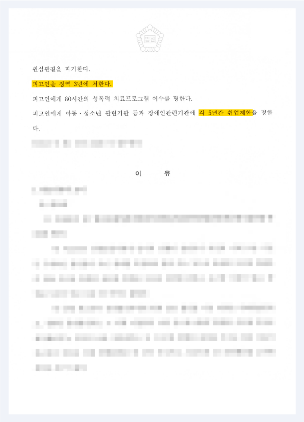 첫 판결에 대하여 피고인은 항소를 하였지만, 이재희 변호사는 검찰에 항소를 요청하여 2심에서는 1심보다 더 높은 형량을 얻어내는 쾌거 또한 이룩할 수 있었습니다.