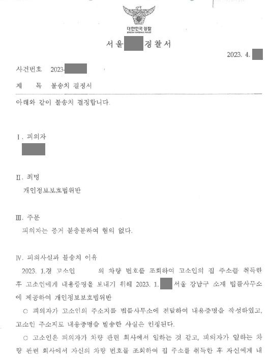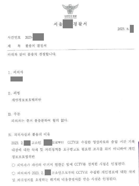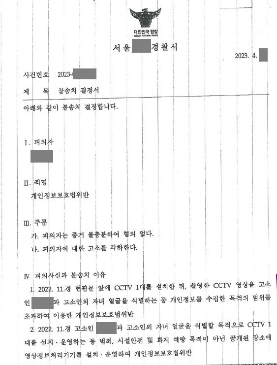 경찰은 수사 결과 ① 무단 취득에 대해서는 의뢰인이 대체 어떤 부정한 수단을 사용해서 개인정보를 취득하였다는 것인지 특정조차 되지 않았다는 점, ② CCTV 설치에 대해서는 택배 분실 등 방범 목적을 위한 것이라는 점, ③ 개인정보 삭제 미조치에 대해서는 방법 목적의 설치일 뿐 이웃집 주민이 개인정보를 삭제 요구한 이후에도 해당 개인정보를 보유한 사실이 없다는 의뢰인의 주장을 받아들여 이웃집 주민의 3차례 고소에 대해 모두 불송치결정을 하였습니다.