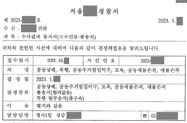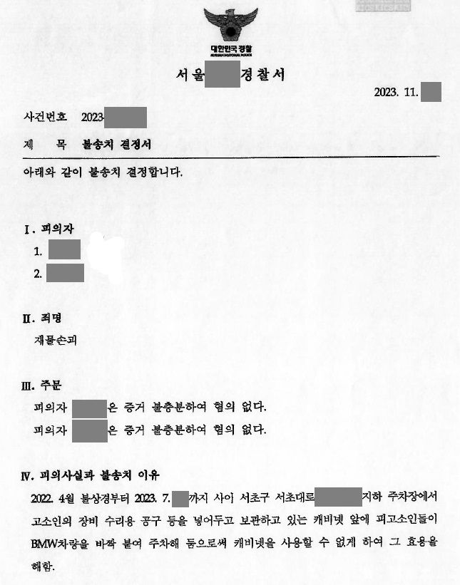 ④ 재물손괴에 대해서는 고소인이 캐비닛을 정상적으로 이용하는 블랙박스 영상 등을 제출하여 불송치결정(무혐의처분)을 받았으며, 고소인에 대하여 별도로 무고죄 고소를 진행 중입니다.