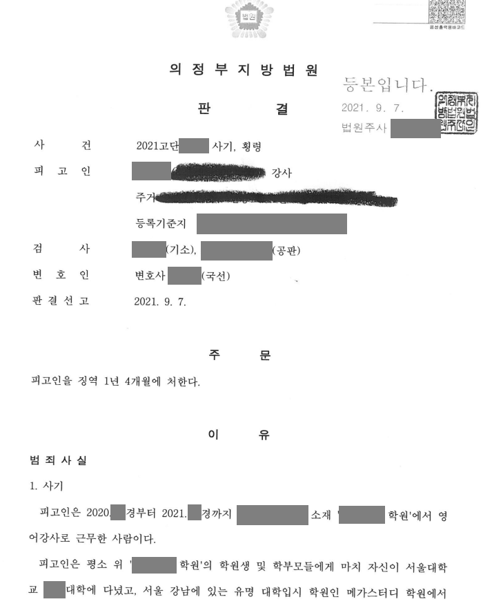 수사를 통해 가해자가 자랑하던 학력과 강남 유명 입시학원에 근무한 경력이 모두 허위였고, 컨설팅을 해주겠다며 받은 돈도 모두 유흥비와 비트코인 등 가상화폐 투자비용으로 탕진한 것이 확인되었습니다. 가해자는 구속되었고 1심에서 징역 1년 4개월의 실형에 처해졌으며, 현재 의뢰인은 손해배상을 받기 위한 민사소송을 진행하고 있습니다.