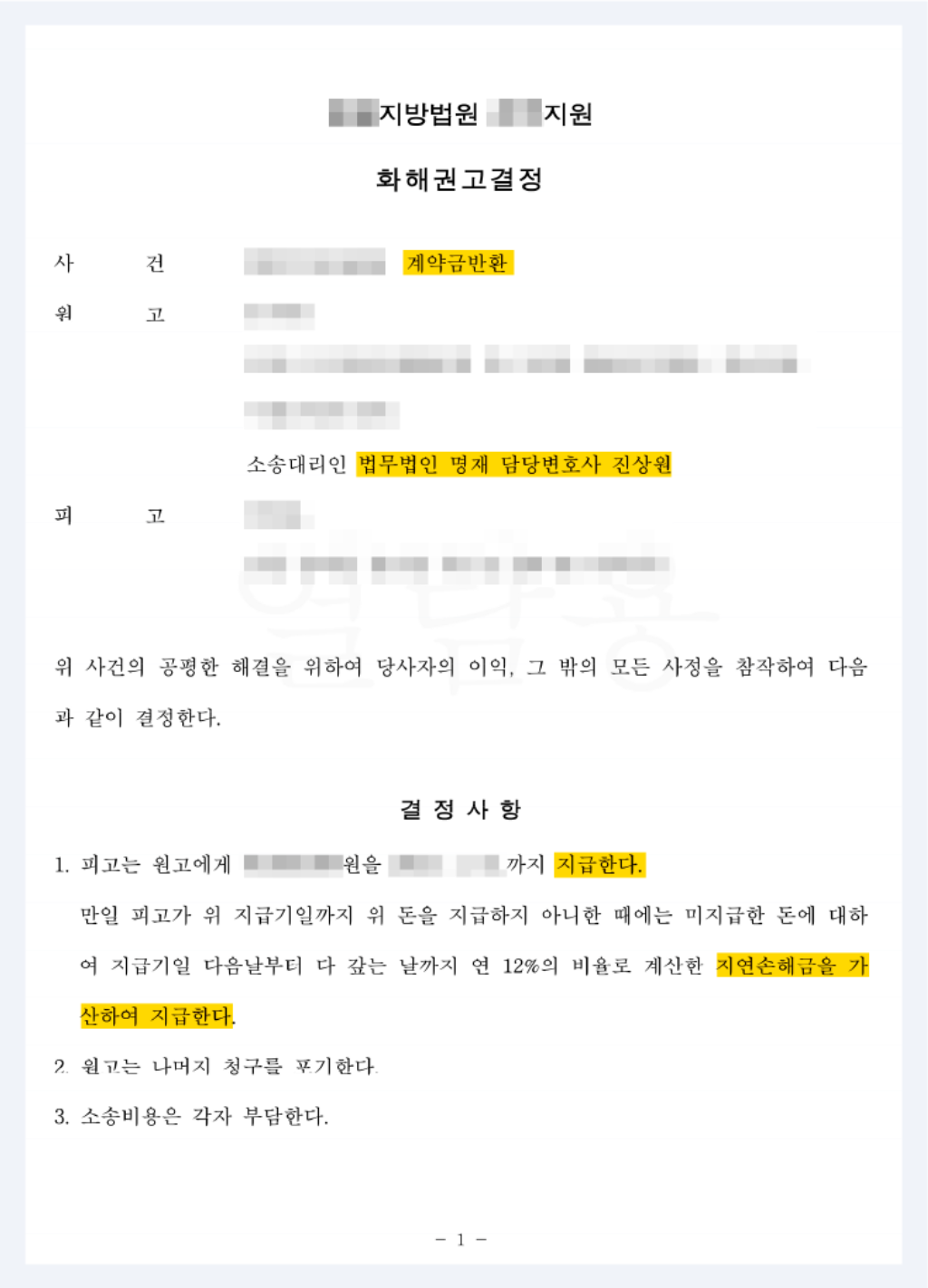 진상원 변호사의 이러한 증거수집 및 적극적인 변론으로 판사님께선 매도인에게 ‘계약금 전액을 돌려주라’는 화해권고결정을 내렸고, 매도인도 이의하지 못해 그대로 확정되었습니다.