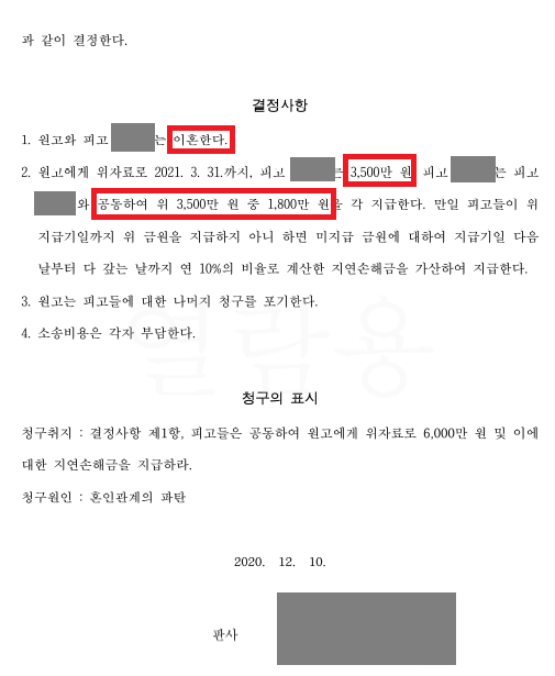 법원은 의뢰인의 남편과 상간녀에게 3500만원의 위자료를 지급하라는 판결을 선고하였습니다. 남편은 사업 실패로 인해 재산이 전혀 없는 상태였기 때문에 승소를 하더라도 실질적으로 돈을 지급받기가 어려웠는데, 법원의 판결로 대부분의 위자료를 상간녀에게 받을 수 있게 되어 의뢰인은 금전을 현실적으로 확보할 수 있었습니다.