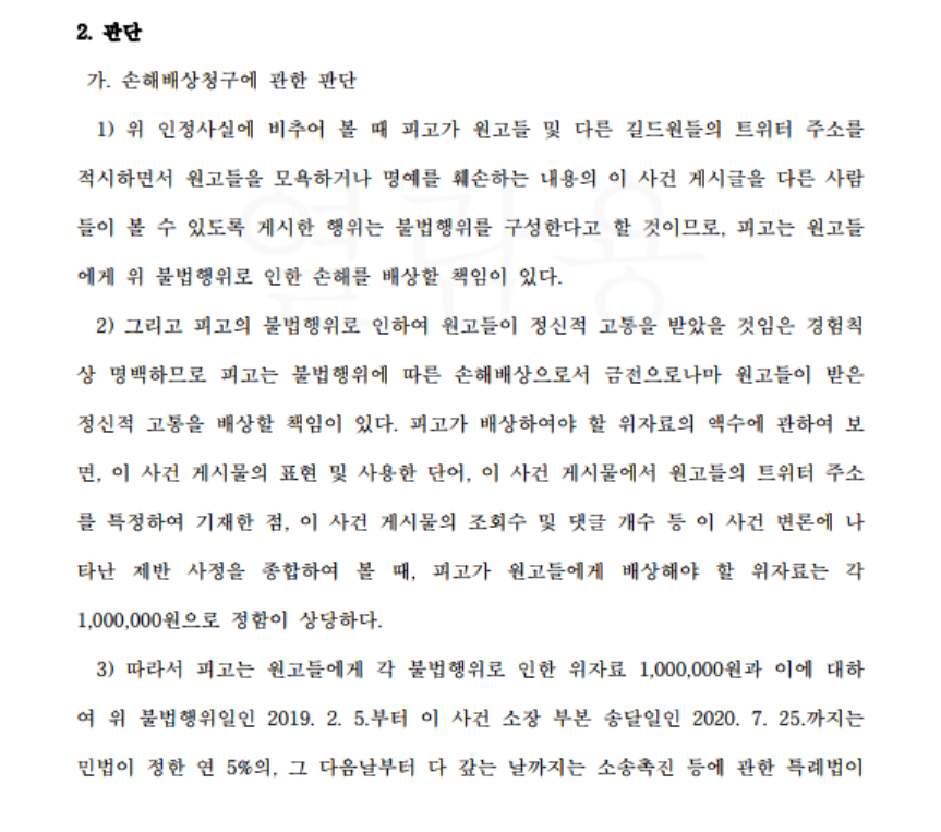 기사 제목은 이 사건에서 마치 원고들을 "페미(니스트)"라고 표현한 부분이 모욕(명예훼손)인 것처럼 작성되어 있으나, 원고들이 소속된 길드원들 전체에 대하여 남자를 꼬셔 돈을 갈취한다, 같은 여자로서 부끄럽다(참고로 피고는 트렌스젠더로 아직 법적으로는 남성이지만, 본인을 여성이라고 생각하고 있음)는 취지로 작성한 부분이 모욕죄로 인정되었고, 민사적으로 불법행위 인정되어 법원에서 소송을 제기한 4명에 대해 위자료 배상하라는 취지로 판결된 사안입니다. 일부 여성혐오 사이트에서 이 판결에 대하여 "페미" = "모욕 표현"이라는 식으로 공격을 가하고 있는데, 이는 명백한 오류입니다.