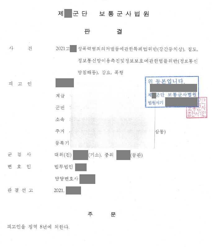 법원은 우리가 고소했던 죄명인 성폭력처벌법위반(강간등치상), 절도, 정보통신망법위반(정보통신망침해등), 강요, 폭행 등 5개의 혐의를 모두 인정하여, 가해자인 남자친구에게 징역 8년을 선고하였습니다. 이로 인해 가해자는 장기간 구금되었고, 의뢰인은 가해자가 사회로 금방 복귀하여 신고를 한 자신에게 보복을 하면 어쩌나 하는 두려움으로부터 해방될 수 있었습니다.