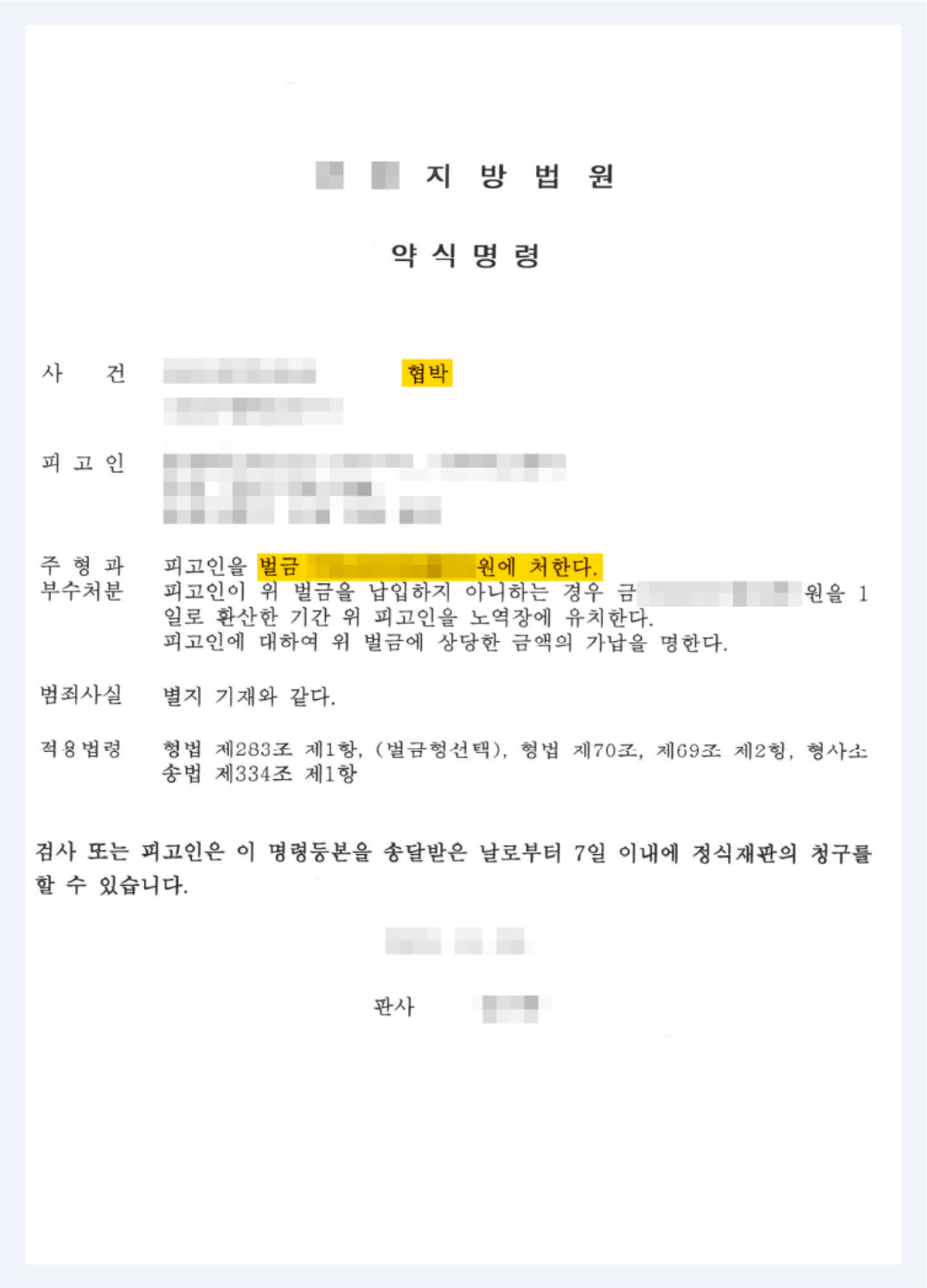 결국, 최안률 변호사의 변론으로 피고인은 협박죄가 인정되어 약식명령 벌금형을 선고받게 되었습니다.