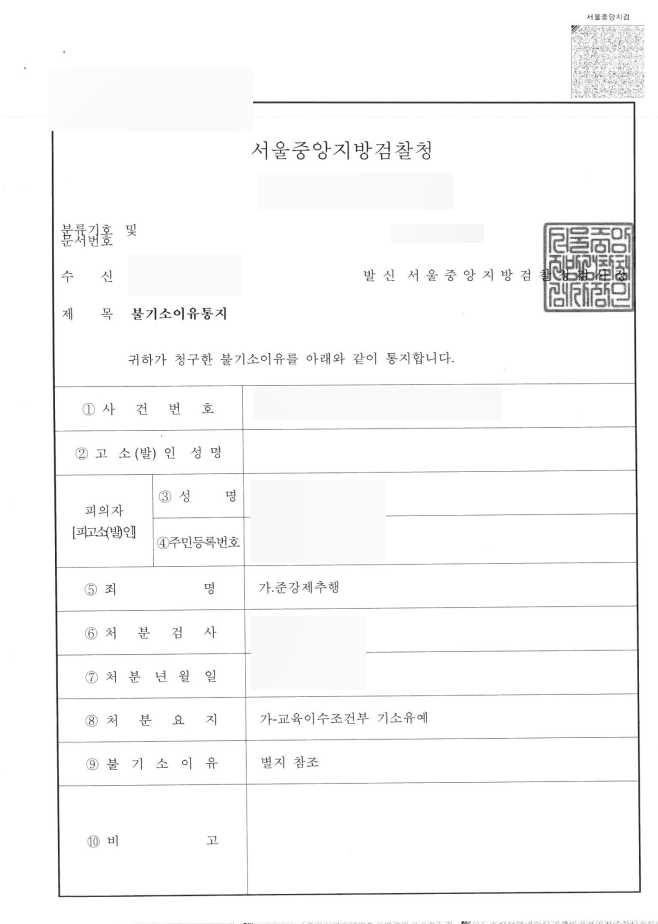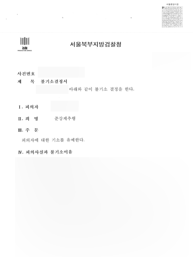 피고소인의 피의 사실은 인정되지만 피고소인은 동종 범죄 경력이 없으며, 피해자와 원만히 합의하였고, 피의자가 잘못을 뉘우치고 깊이 반성하고 있으며 보호 관찰소에서 실시하는 성폭력사범 재범 방지 교육 참가에 동의한 점을 고려하여 기소 유예 판결을 받았습니다.