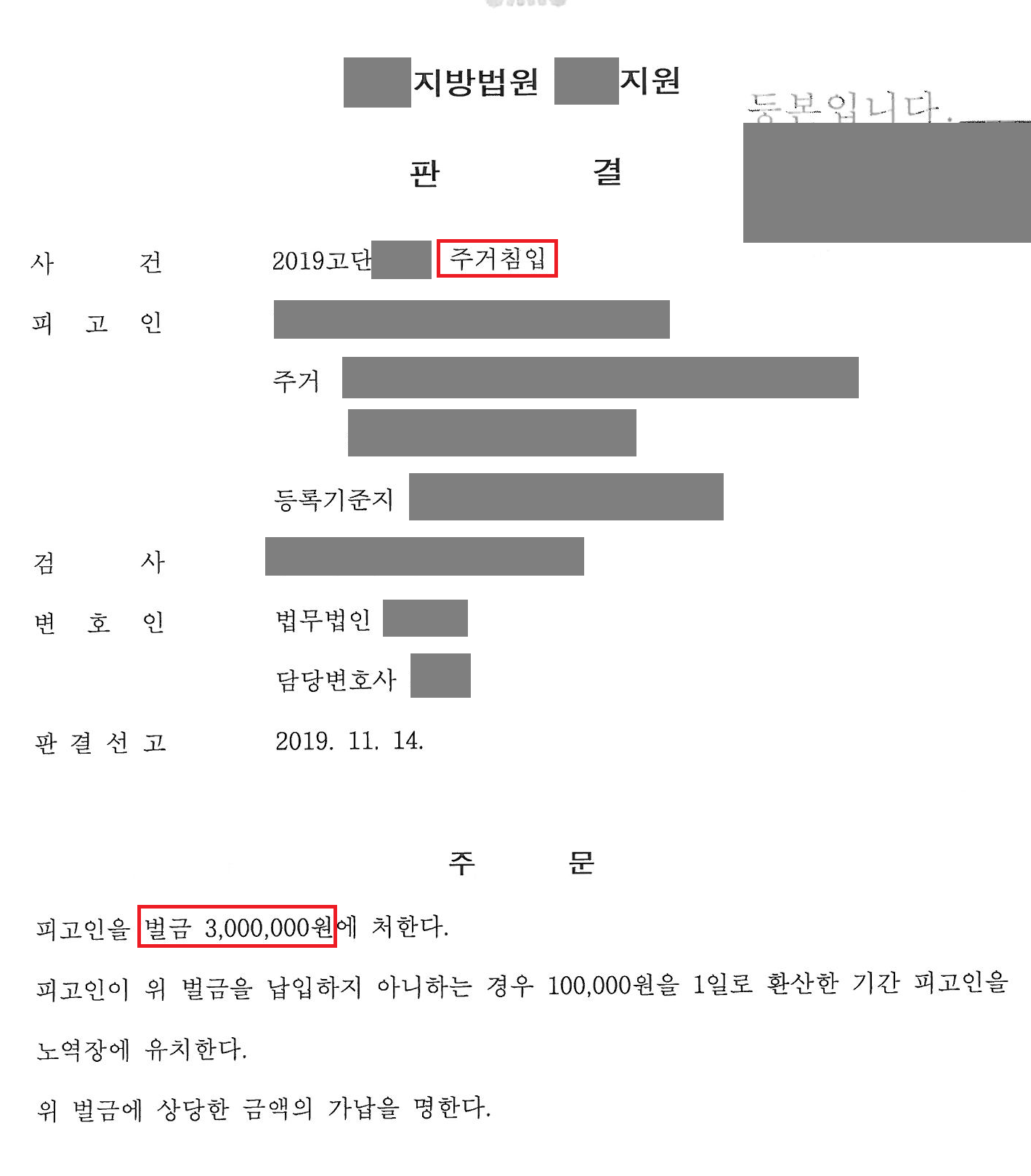 법원은 의뢰인에게 주거침입 혐의를 유죄로 인정하고 벌금 300만원을 선고하였습니다. 이는 의뢰인이 범행을 인정하고 반성하는 모습을 보이며 피해자와도 합의를 하였기 때문에 비교적 가벼운 처벌을 받은 것이었고, 의뢰인은 인신구속이나 징역형을 피하며 사건을 조속히 마무리할 수 있었습니다.