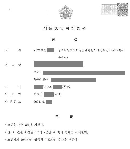 법원은 전 남자친구에게 징역 8월, 집행유예 2년, 40시간의 성폭력 치료강의 수강을 선고하였습니다. 가해자 측 변호인이 당시 교제하던 사이였고, 초범인데다 수년 전 사건이라는 점, 사진 촬영뿐이고 유포도 없었다는 점 등의 양형사유를 주장하였음에도 엄한 처벌을 받은 것이었습니다. 또 민사소송을 통해 의뢰인은 별도로 1,200만원의 손해배상금을 받아낼 수 있었습니다.