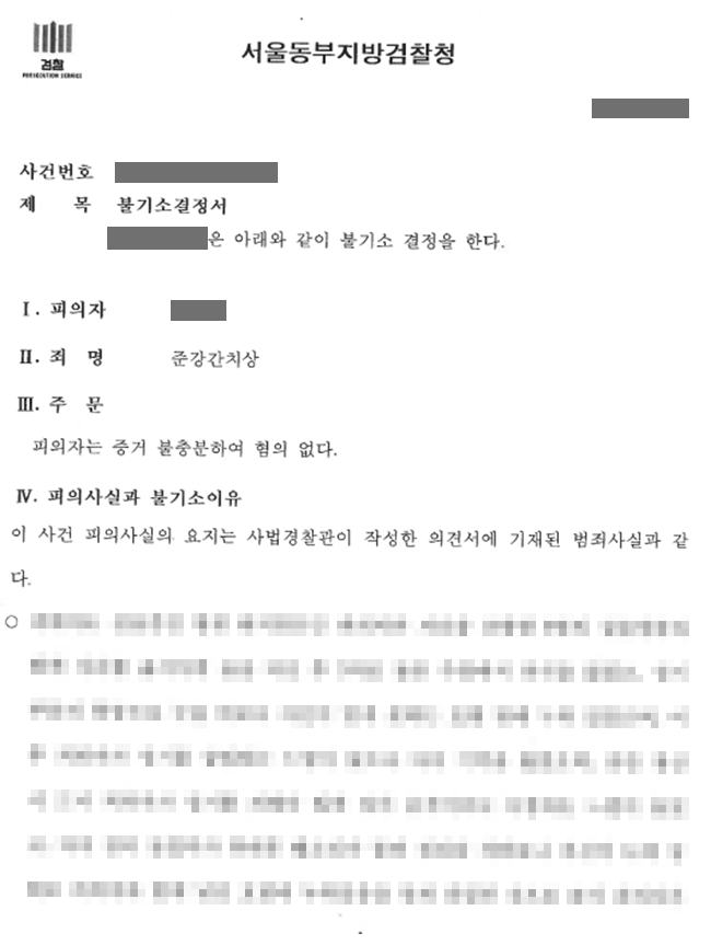 검찰은 법무법인 명재의 변론을 받아들여 의뢰인의 준강간 혐의에 대해 불기소처분을 하였습니다. 덕분에 의뢰인은 하룻밤 잠자리로 인해 억울하게 성범죄자가 될 수도 있었던 위기에서 벗어날 수 있었습니다.