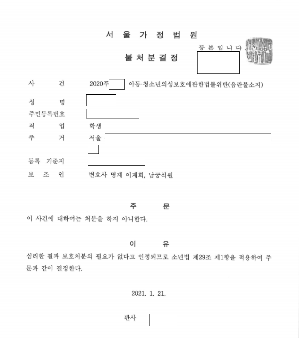 소년의 잘못은 인정되나 반성하고 있는 점을 참작하여 소년보호처분을 하지 않는 불처분 결정
