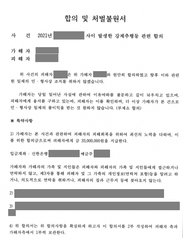 의뢰인은 합의금으로 3,300만원을 지급받아 형사 고소 또는 추가적인 민사 손해배상 청구 없이 사건을 마무리 지을 수 있었습니다. 20대 중반의 대학생에 불과한 가해자도 형사처벌을 받지 않고 피해자로부터 용서를 받을 수 있었습니다.