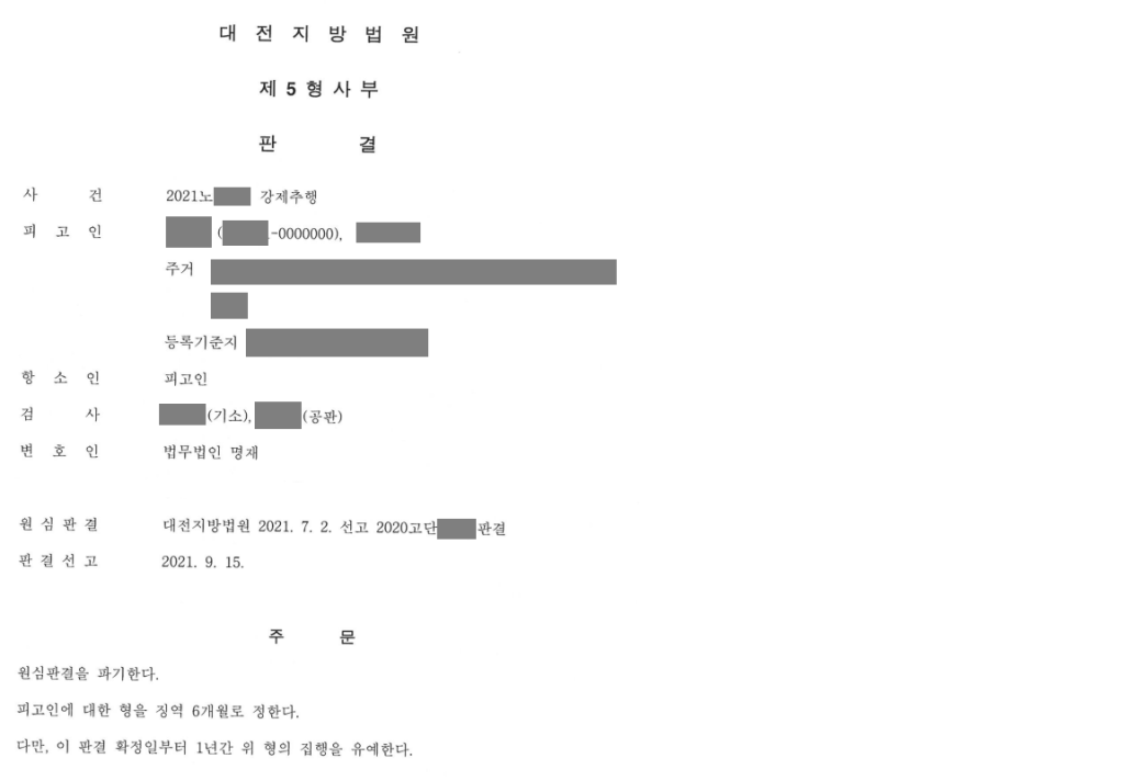 의뢰인은 여성의 동의하에 무릎을 베고 누워 있었으며 키스도 동의하에 이루어졌다고 주장하면서 강제추행이 아니라고 항변하였습니다. 그러나 고소인인 여성이 의뢰인을 자신의 원룸에서 퇴거시킨 직후 경찰에 신고한 점과 피해 사실에 대하여 일관된 진술을 하고 있는 점 등이 유죄의 증거로 인정되어 의뢰인은 징역 6개월의 실형을 선고받았고, 법무법인 명재는 항소심에서 피해자와의 합의에 주력하였습니다.