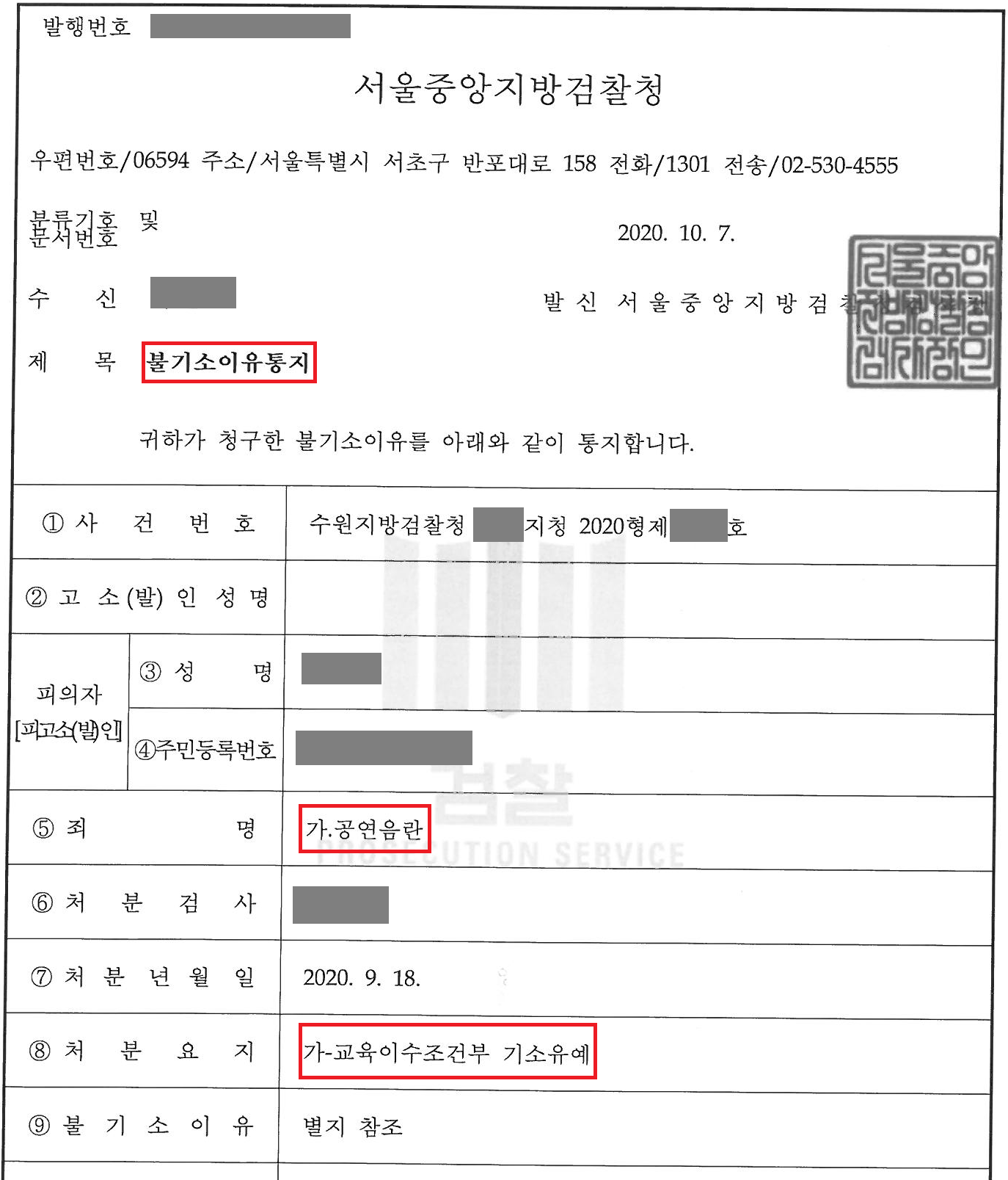 검찰은 사건이 경미하고 피해자도 처벌을 원치 않고 있다는 사정을 고려하여 공연음란죄 혐의에 대하여 교육조건부 기소유예 처분을 내렸습니다. 덕분에 의뢰인은 검찰 조사 없이 단 한차례의 경찰 조사만으로 아무런 전과 없이 사건을 마무리할 수 있었습니다.