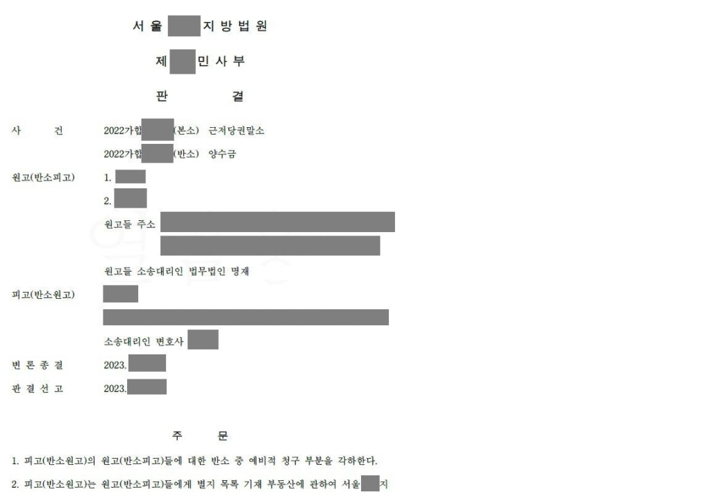 법원은 법무법인 명재의 이와 같은 주장을 받아들여서 이 사건 근저당권의 피담보채권은 처음부터 성립하지 아니하였거나 소멸시효의 완성으로 소멸하였고, 그에 따라 근저당권 역시 소멸하였으므로 피고에게 근저당권설정등기의 말소등기절차를 이행할 의무가 있다는 원고 승소 판결을 선고하였습니다. 이로써 의뢰인은 아파트에 설정된 근저당권을 말소시키고 가장 큰 재산인 아파트를 무사히 지킬 수 있었습니다.