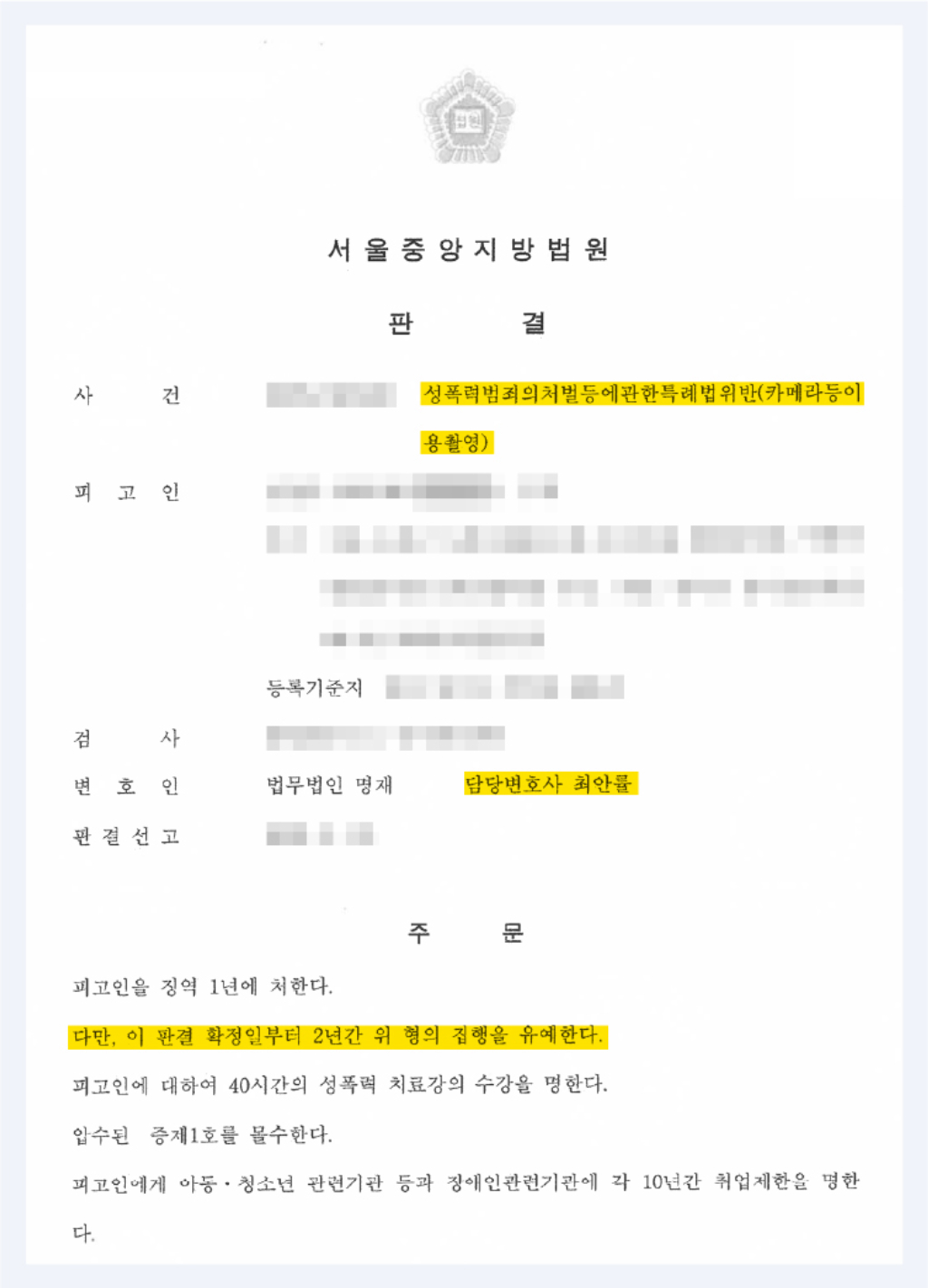 특히 의뢰인이 촬영한 사진과 영상들에는 피해자의 얼굴이 드러나지 않아 개인이 명확하게 식별되지 않는다는 점도 중요하게 주장했습니다. 이러한 여러 양형 요소를 최안률 변호사는 변호인 의견서에 체계적이고 꼼꼼하게 정리해 제출하며 선처가 필요하다는 점을 강하게 호소했습니다.