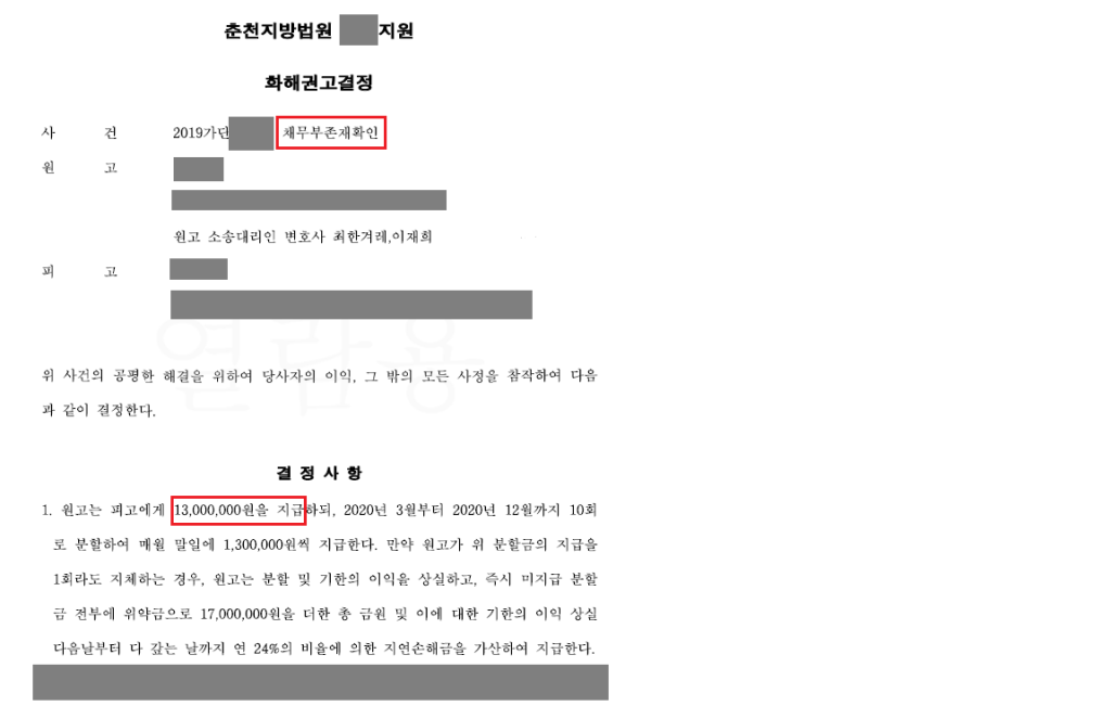 이미 공증까지 받아 결국 해당 각서를 취소시키지는 못했지만, 법무법인 명재의 적극적인 변론을 통해 의뢰인은 피고에게 1,300만원만 지급하는 것으로 합의를 할 수 있었습니다. 법원은 같은 내용으로 화해권고결정을 하였고 의뢰인은 과도한 채무 부담에서 벗어날 수 있었습니다.
