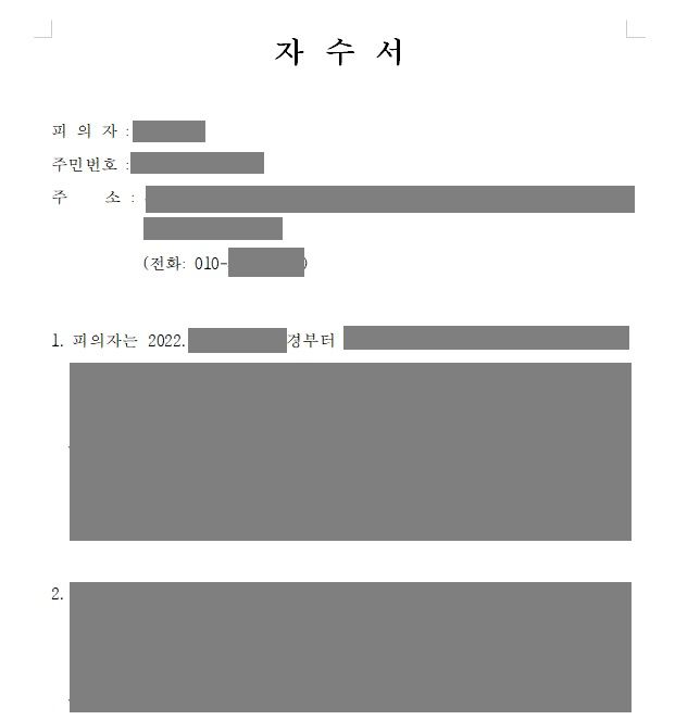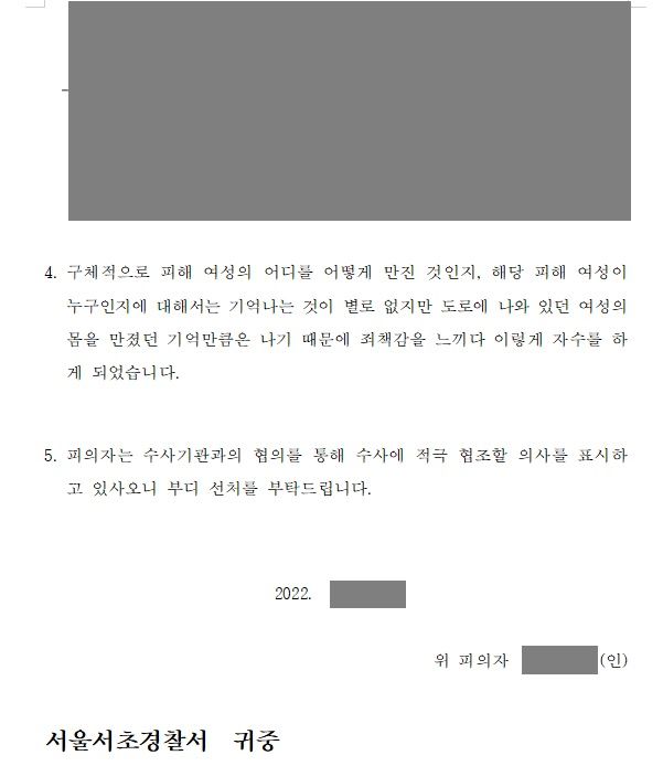 당시 의뢰인 또한 상당히 취해있었기 때문에 여성의 몸을 만졌다는 의뢰인의 기억조차 정확하다고 볼 수는 없지만, 만일 실제로 신고가 이루어져 수사가 개시될 경우 아무리 초범이라 하더라도 징역형에 집행유예까지 가능한 상황이었기 때문에 법무법인 명재는 자수서를 제출하여 양형을 대비하는 한편 경찰의 수사상황을 살펴보았습니다.