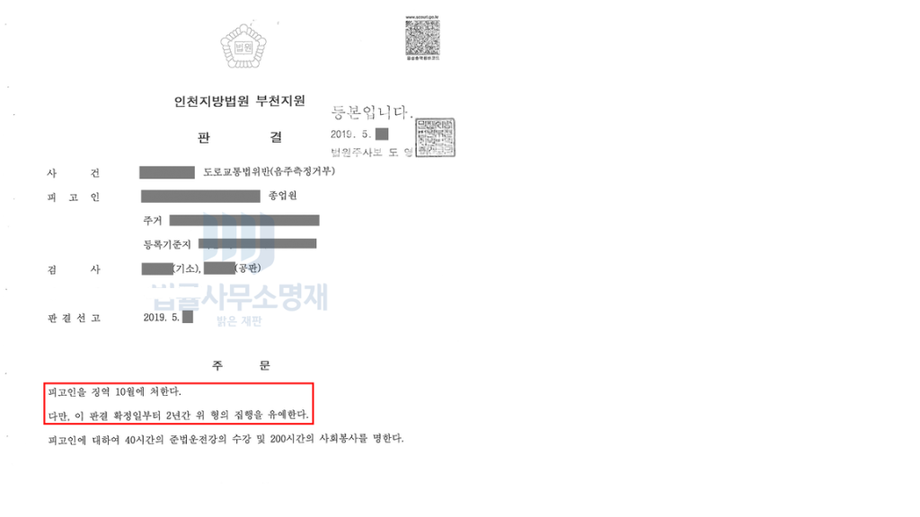 법무법인 명재는 기존 집행유예 기간을 도과시키면서도, 이 음주 측정 거부 사건에서도 최대한의 선처를 받아 집행유예를 받을 수 있도록 변론 방향을 설정하고 적극적으로 변론을 하였습니다.