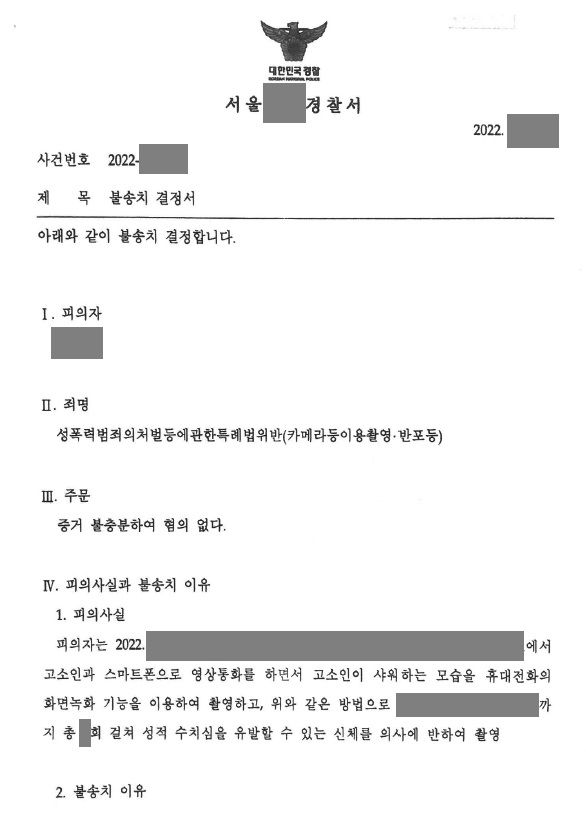 수사기관도 역시 법무법인 명재의 법리 주장을 받아들이며 고소인이 스스로 자신의 신체와 샤워하는 모습을 핸드폰 카메라에 비춘 것으로, 그 영상은 고소인이 자신의 의사에 따라 직접 자신의 신체를 촬영한 것이지 피의자가 직접 촬영한 것이라고 인정하기 어렵다며 불송치 결정을 내렸습니다. 이로써 의뢰인은 수사단계에서 무혐의로 사건을 마무리할 수 있었습니다.