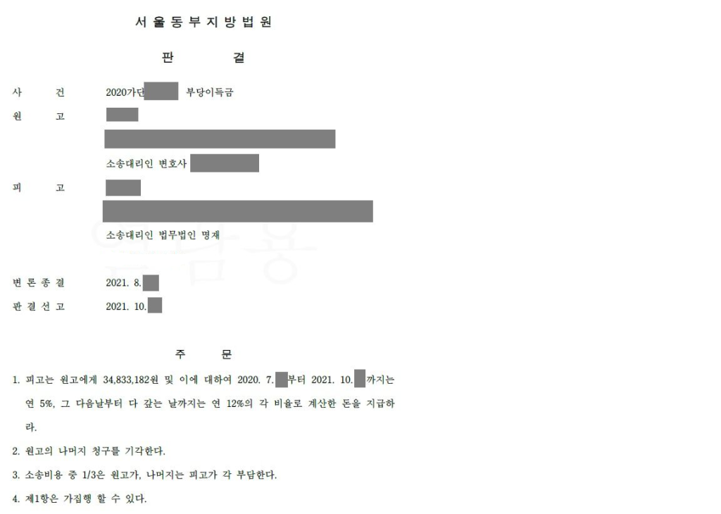 법원은 의뢰인에게 3,400만원을 지급하라고 판결하였습니다. 이는 원고들이 처음에 청구한 억대의 청구금액에 비하면 많이 줄어든 것이었습니다. 법무법인 명재의 적극적인 변론으로 원고 중 한 명은 재판 과정에서 소를 취하하였고, 다른 원고의 청구금액 또한 2,000만원 이상 감액시켜 의뢰인의 금전 피해를 최소화할 수 있었습니다.