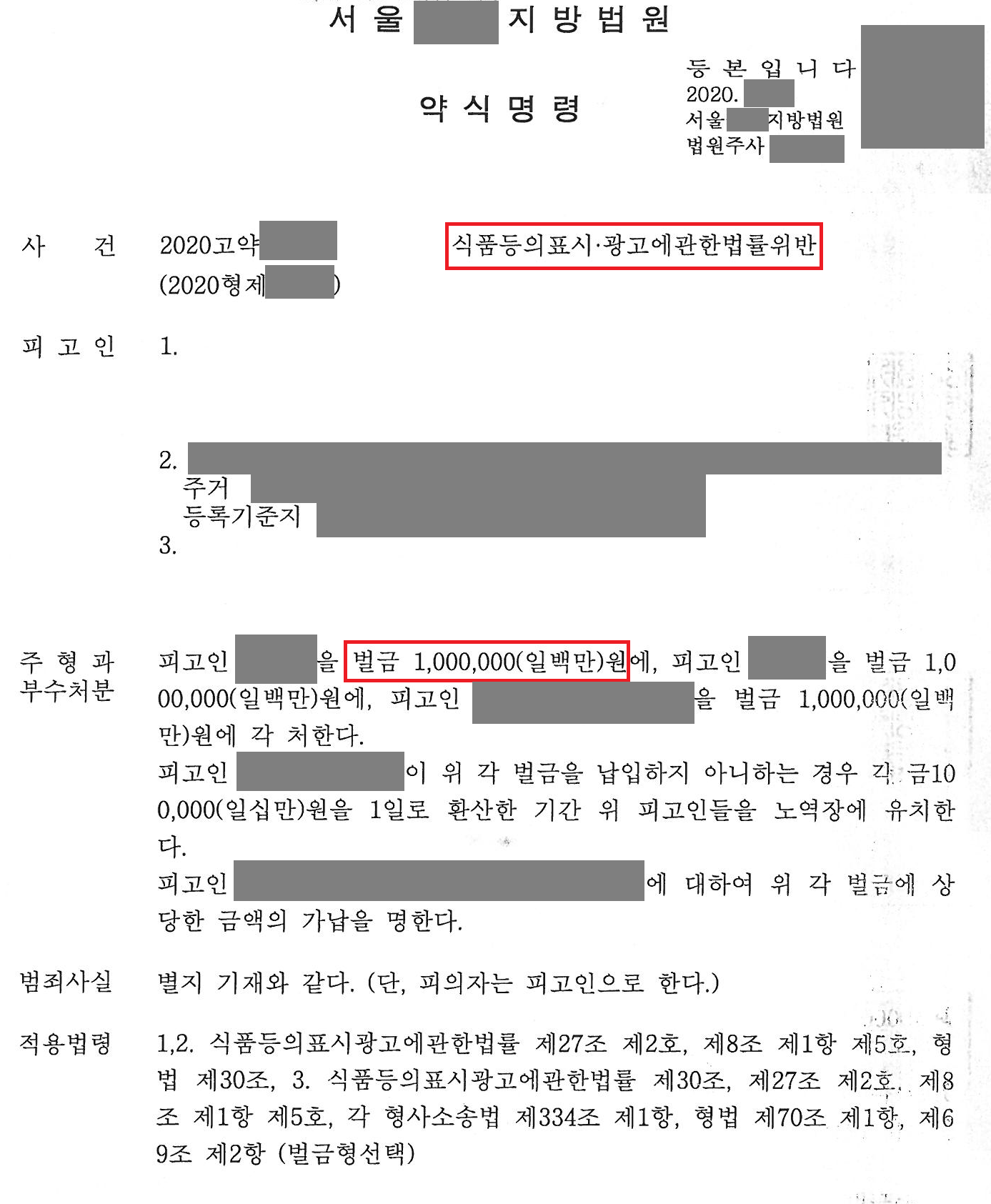 문제가 된 부분은 여러 사람들의 체험기 등을 이용한 형태의 광고였습니다. 온라인을 통해 제품을 판매하는 경우에는 이용자들의 긍정적인 후기를 광고에서 적극적으로 활용하는 일이 다반사인데, 이는 식품표시광고법 시행령에서 엄격히 금지하고 있는 "소비자를 현혹하는 표시·광고"에 해당하기 때문입니다. 법무법인 명재는 일회성 광고에 불과하였고, 문제가 되자 즉시 광고를 삭제하고 사과문까지 게재하였다는 점을 변론하여 선처를 호소하였습니다.