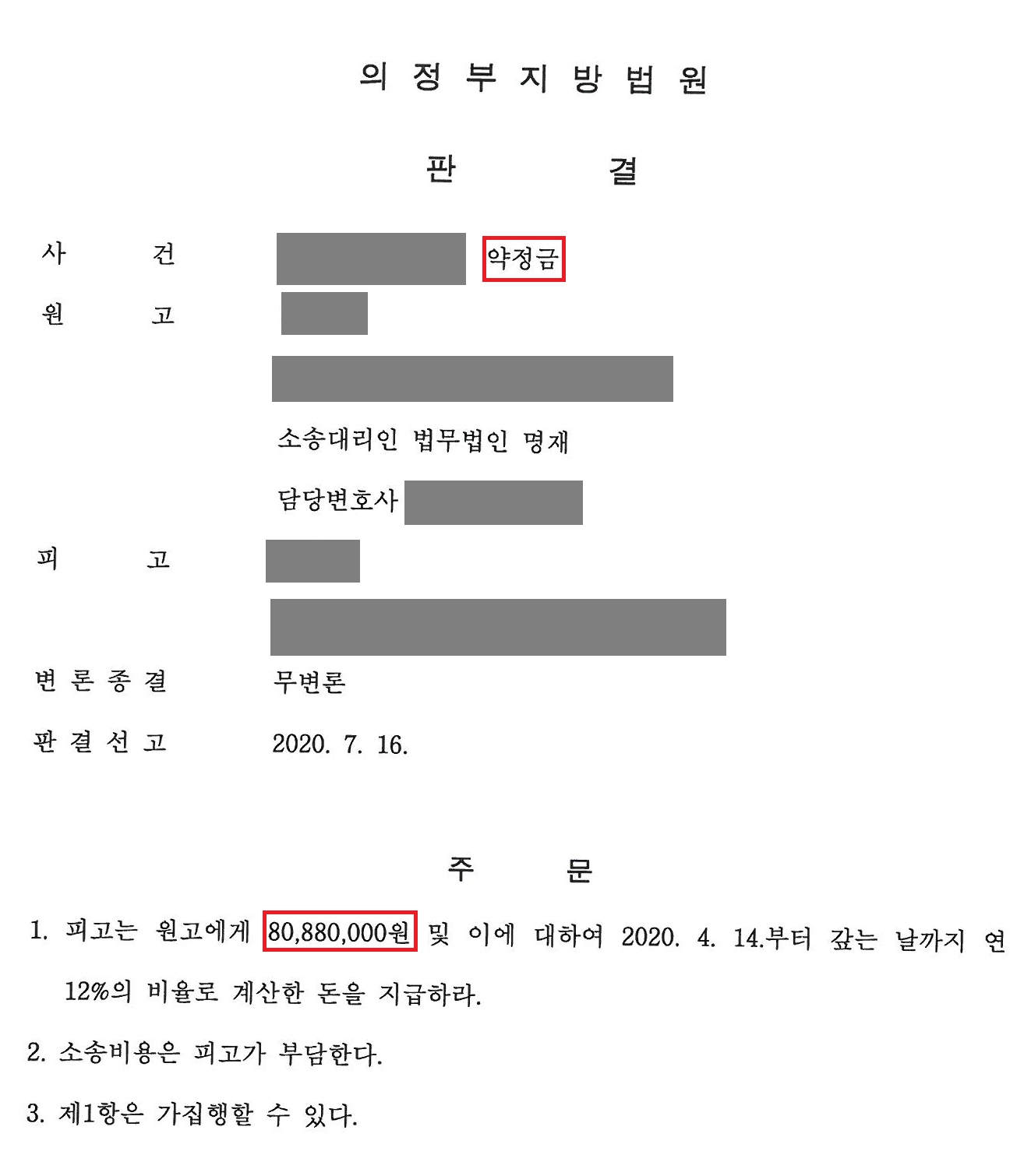 채무자는 법원의 소송서류를 의도적으로 송달받지 않는 등 최대한 시간을 끌면서 소송 진행을 지연시켰으나, 법원은 대여금으로 처리했던 약속어음 전액과 이에 대한 지연이자를 의뢰인에게 지급하라는 판결을 선고하였습니다. 의뢰인은 채권이 소멸되기 전 적절한 법적 조치를 통해 소멸 위기에 놓여있던 채권을 확보하고 연 12%의 지연이자 또한 지급받을 수 있게 되었습니다.