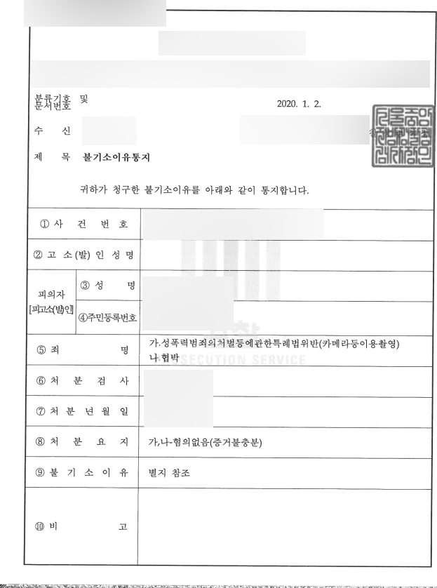 피의자가 숙박 업소에서 고소인의 나체 사진을 촬영한 사실은 인정하고 있으나 피해자의 동의 하에 사진을 촬영한 것이라 진술하였습니다. 또한 촬영 당시 매우 근접하게 피해자를 촬영했기에 피해자 몰래 촬영했다고 보기 어렵다고 보았고, 피해자의 최초 진술 만으로는 피의사실을 인정하기 어렵다고 보았습니다. 또한 피의자는 피해자의 나체 사진 5장을 갖고 피해자의 남편에게 보내겠다는 협박을 문자를 통해 전송하였다고 피해자가 진술하였으나, 피의자는 교제 사실을 남편에게 알리겠다는 취지의 말을 한 적은 있지만 나체 사진을 전송하며 협박을 한 사실은 없다고 진술하였습니다.