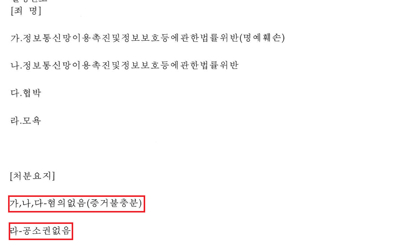 검찰은 고소된 내용 중 정보통신망법 위반(명예훼손), 정보통신망법 위반(비밀침해), 협박 혐의에 대해서는 무혐의처분을 하였고, 모욕 혐의에 대해서는 불기소(공소권 없음) 처분을 하였습니다.