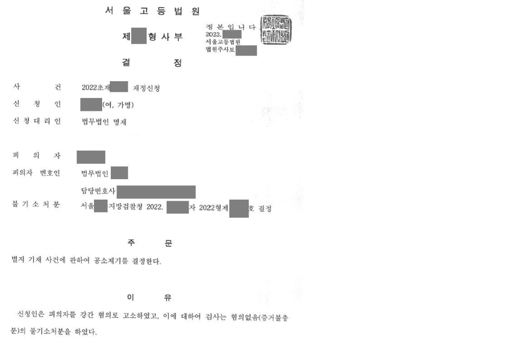 법원은 고소인측의 이러한 법리 주장을 받아들여 피의자의 강간 혐의에 대하여 공소를 제기함이 상당하다며 공소제기를 결정하였습니다. 강간 피해를 입고도 가해자에게 아무런 형사 처벌도 없이 종결될 수 있었던 사건이 이렇게 법원에서 정식재판으로 진행될 수 있게 되었습니다.